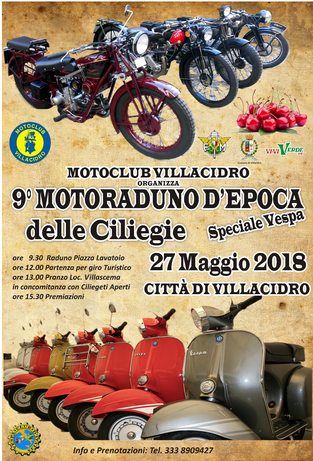 Il MOTOCLUB VILLACIDRO è lieto di invitarVi al 9° MOTORADUNO D’EPOCA “delle Ciliegie” SPECIALE VESPA che si terrà a VILLACIDRO il 27 MAGGIO 2018, in concomitanza dei CILIEGETI APERTI in località VILLASCEMA .